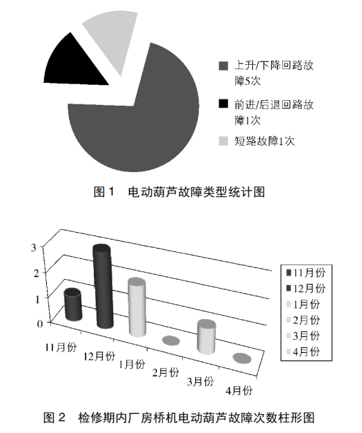 通過對 2013—2014 年檢修期電動葫蘆故障類型統(tǒng)計( 圖 1) 及檢修期內(nèi)廠房橋機電動葫蘆故障次數(shù)柱形圖( 圖 2) 的調(diào)查分析得出: 上升/下降控制回路故障次數(shù)為5 次,前進(jìn)/后退控制回路故障 1 次,短路故障 1 次。由此可見,電動葫蘆控制回路的可靠性有待進(jìn)一步提高。