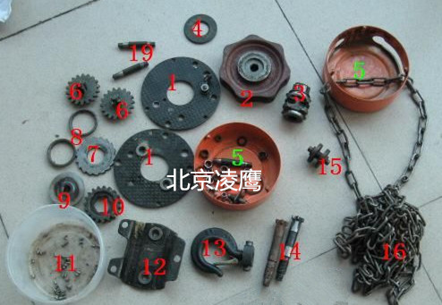 下面介紹一下手拉葫蘆的各部件名稱對照表,1位側板,2為手鏈輪,3位起重鏈輪,4位摩擦片,5位外殼,6位四齒短軸,7為棘輪,8位軸承外套,9位摩擦片座,10位花鍵孔齒輪,11為軸承滾珠,12外側板,13固定鉤,14五尺長軸,15起重鏈靠輪,16手拉鏈,17起重鏈,18起重吊鉤,9固定軸。