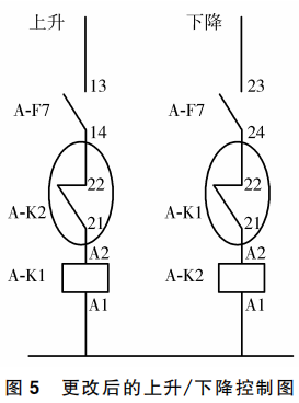 建議:由于橋機電動葫蘆一般在檢修期使用較多,平時多為停止狀態,其廠房內振動較大,所以要注意日常維護,檢查元器件是否動作良好,有無銹蝕、接線松動等現場,并及時處理。更改其上升、下降控制圖如下:
