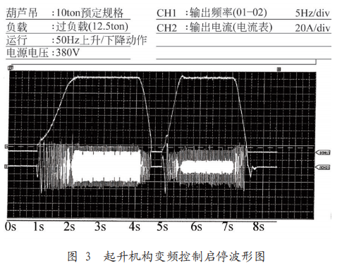 根據以往進行的變頻器用于葫蘆起升機構的專項試驗數據,采用變頻控制時,起升電機啟動、停止時變頻器輸出電流隨著輸出頻率的增減會有短時間的震蕩,此過程如未采用可靠地抗干擾措施,則可能會對其他控制性元件特別是電子器件產生一定的干擾從而引起其他元器件工作不正常。