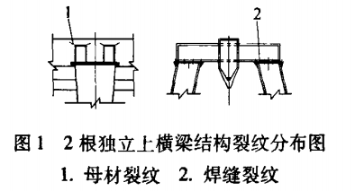 在一側(cè)支腿上方的上橫梁由2根獨(dú)立的小箱形梁(或工字鋼)結(jié)構(gòu)組成,如圖1所示。產(chǎn)生裂紋的原因?yàn)閼?yīng)力集中、受力不均勻及剛度不足。