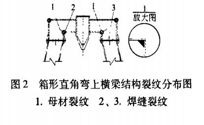 上橫梁彎折處裂紋,采用不合理的90°彎折,如圖2所示。上橫梁的下蓋板角焊縫及腹板產(chǎn)生裂紋,主要是因?yàn)閼?yīng)力集中引起。