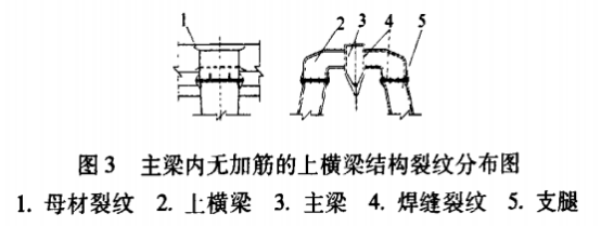 上橫梁與主梁連接處在焊縫及母材上都出現(xiàn)過(guò)裂紋,如圖3所示。主要原因是主梁內(nèi)部與上橫梁腹板連接對(duì)應(yīng)位置缺少加勁肋板,造成主梁與上橫梁之間傳力不暢,腹板局部穩(wěn)定性不足,加上焊接應(yīng)力集中,致使在連接部位造成疲勞裂紋。