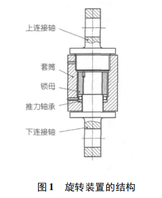 鋼絲繩旋轉裝置的結構見圖1,上連接軸1與套筒2通過螺紋連接,并用銷釘鎖死形成一體,與此類似下連接軸5穿入套筒內后,與套筒內的鎖母3旋合并鎖死,這樣整個裝置就分為上下兩部分。這兩部份通過中間的推力軸承4連接起來。該裝置最大的特點在于,由于有推力軸承存在,上下兩部份可以獨立地轉動,即在上連接軸發生旋轉時,下連接軸保持不動,這正滿足了解決鋼絲繩“打麻花”問題的要求。