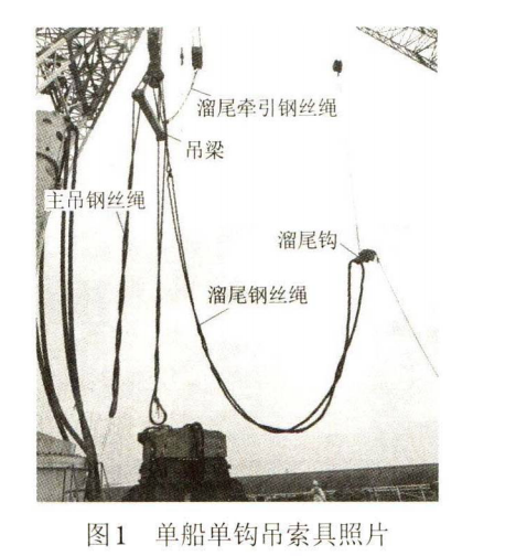 根據(jù)樁長(zhǎng)、樁重、水深、吊耳高度及吊距,選用單鉤起重船。吊索具配置有溜尾鉤、溜尾鋼絲繩、溜尾牽引鋼絲繩、吊梁及主吊鋼絲繩等。先采用卡環(huán)將溜尾鉤與溜尾鋼絲繩連接;然后將吊梁、主吊鋼絲繩、溜尾鋼絲繩掛在主鉤上;然后采用牽引鋼絲繩將溜尾鋼絲繩上端與副鉤相連,見圖1。