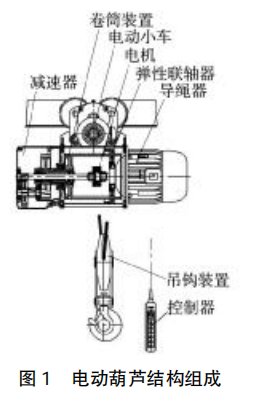 電動葫蘆通常稱為電葫蘆,是一種常見的輕小型的起重設備。常見電動葫蘆的控制方式有兩種,一是使用按鈕在地面跟隨操作,二是在司機室內操控或采用無線遠距離控制。電動葫蘆一般由電機、傳動機構和卷筒裝置或鏈輪機構組成。電動葫蘆可以分為鋼絲繩電動葫蘆和環鏈電動葫蘆兩種。鋼絲繩電動葫蘆可以分為鋼絲繩電動葫蘆和環鏈電動葫蘆兩種。鋼絲繩電動葫蘆又可以分為單速提升型、雙速提升型、微型電動葫蘆、卷揚機、多功能提升機等多種類型。化工廠常用電葫蘆為微型電動葫蘆或懸臂葫蘆,往往在加料或維修車間頻繁進行檢維修作業的固定點位安裝,設備拆裝位置因綜合考慮現場空間安全和建造成本往往不會安裝電動葫蘆,化工廠常用電動葫蘆結構組成如圖1所示。