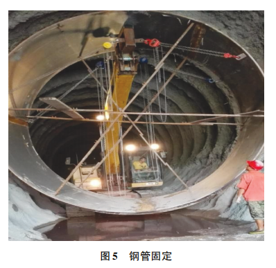 鋼管翻轉(zhuǎn)及固定:采用平板車將鋼管運(yùn)輸?shù)剿矶纯?利用洞頂錨環(huán)和卷揚(yáng)機(jī)進(jìn)行鋼管翻轉(zhuǎn)。挖掘機(jī)液壓反鏟大臂伸到鋼管內(nèi)壁頂部,將專用支架兩側(cè)的兩臺(tái)手拉葫蘆與鋼管上的錨環(huán)進(jìn)行固定。