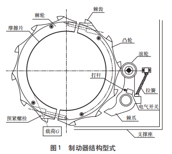 安全制動器結構型式如圖 1 所示,當負載下降時,卷筒逆時針方向旋轉,滾輪在凸輪的激勵下帶動擺臂做周期性擺動。當彈簧作拉力不足以克服擺臂擺動力時,擺動傾角逐漸加大直至帶動棘爪與棘齒嚙合,此時打桿觸發電氣開關,斷開下降方向的控制回路,棘輪通過摩擦阻力實現減速制停。