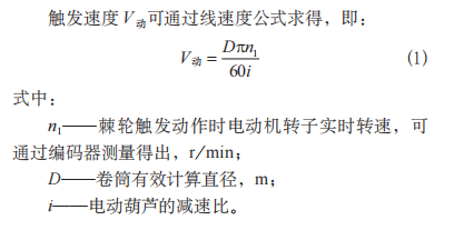 測試時,將電動葫蘆的電機制動輪的鎖緊螺母調松,使其處于松閘狀態。安全制動器觸發速度定義為卷筒加速下降,引起棘輪棘爪嚙合時鋼絲繩繞出卷筒的線速度 ( 單位為 m/s)。并把相關數據代入式(1),得到電動葫蘆安全制動器的觸發速度 V 動。