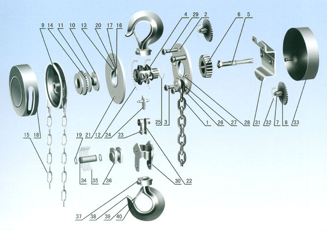 備注:圖中1起重鏈、2右墻板、3支撐桿、4起重鏈輪、5 為5齒長軸、6花鍵孔齒輪、7為4齒短軸、8片齒輪、9手鏈輪、10制動器座、11摩擦片、12滾柱、13軸承外圈、14棘輪、15手鏈條、16棘爪彈簧、17棘爪、18手鏈輪罩殼、19彈性擋圈、20棘爪銷、21、左墻板、22吊鏈板、23吊銷、24擋板、25彈性擋圈、26軸銷、27手輪、29、支撐桿、30下構架、31外墻板、32滾柱、33罩殼、34游輪軸、35、滾桿、36游輪、38吊鉤、39止索夾、40無頭鉚釘。