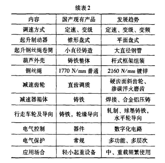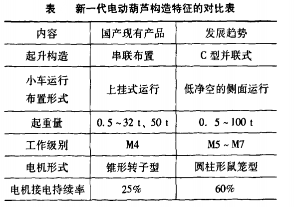 鋼絲繩電動葫蘆之后的發展方向應向重載、大型、高性能化、模塊化發展,成為替代通用橋式起重機的發展趨勢。新一代的電動葫蘆與現有產品的構造特征對比表如下:
