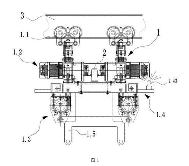 為解決單機晃動的問題,凌鷹設(shè)計了一種雙主機雙鉤的冶金電動葫蘆,包括兩個電動葫蘆,兩個電動葫蘆對稱設(shè)置在軌道上,兩個電動葫蘆之間通過同步器相互連接,包括行走裝置、傳動裝置和吊鉤裝置,行走裝置設(shè)置在軌道上,與傳動裝置相互固定連接,傳動裝置與吊鉤裝置之間設(shè)置有隔熱防護裝置。